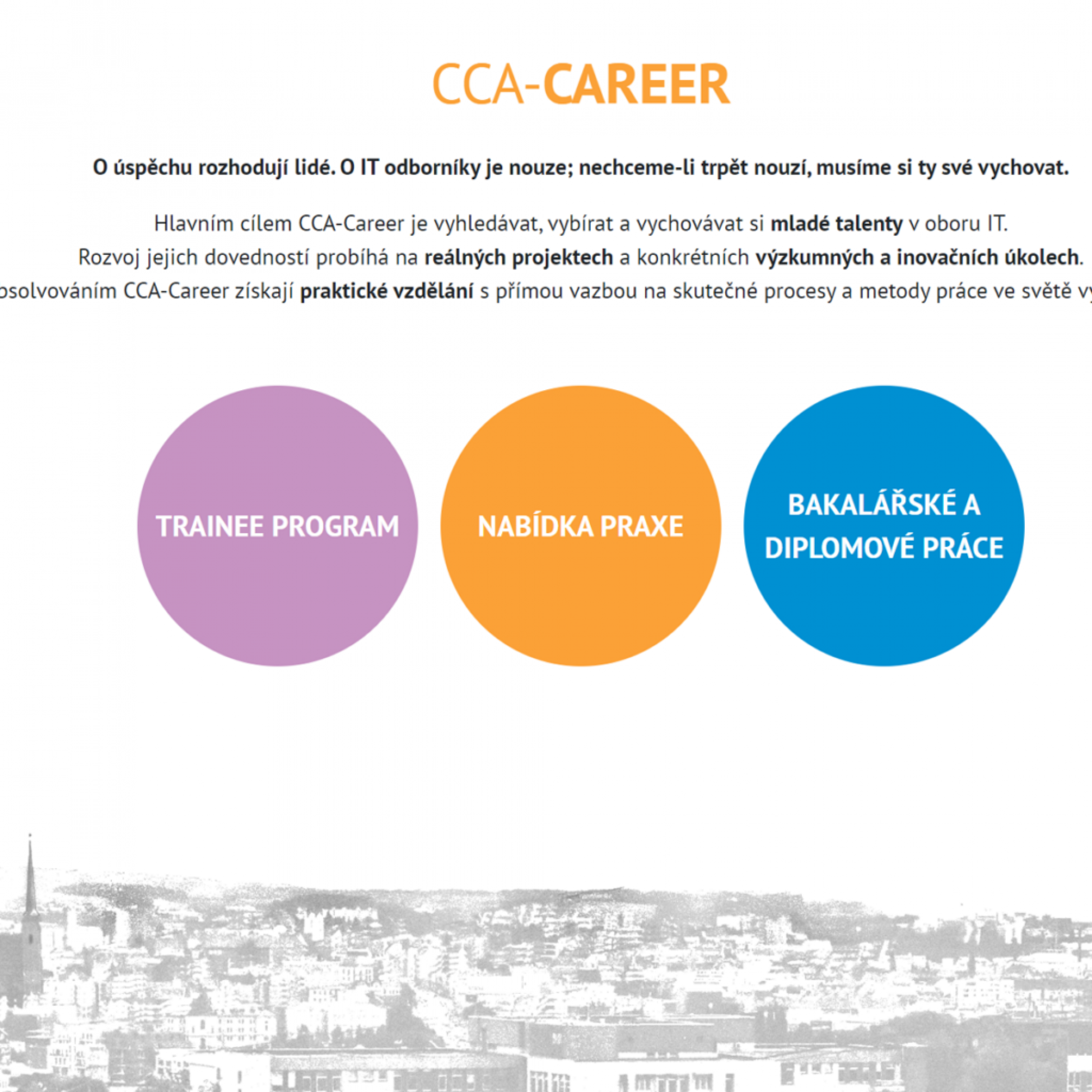 S mottem: "O úspěchu rozhodují lidé. O IT odborníky je nouze; nechceme-li trpět nouzí, musíme si ty své vychovat." startujeme CCA-Career. Jejím hlavním cílem je vyhledávat, vybírat a vychovat si mladé talenty v oboru IT. Rozvoj jejich dovedností probíhá na reálných projektech a konkrétních výzkumných a inovačních úkolech. Absolvováním CCA-Career získají praktické vzdělání s přímou vazbou na skutečné procesy a metody práce ve světě vývoje software.