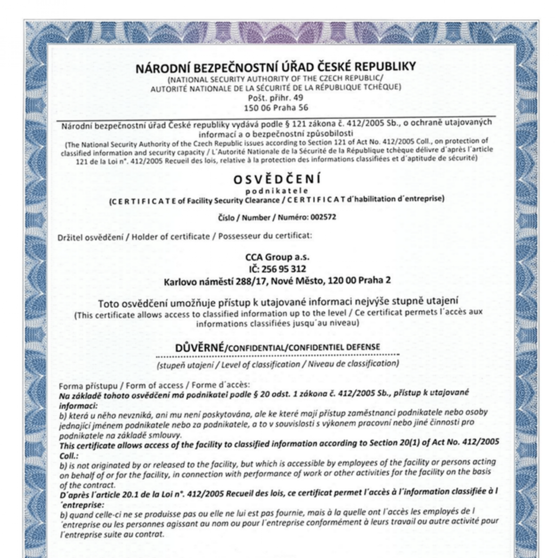 CCA Group a.s. získala Osvědčení z Národního bezpečnostního úřadu ČR.